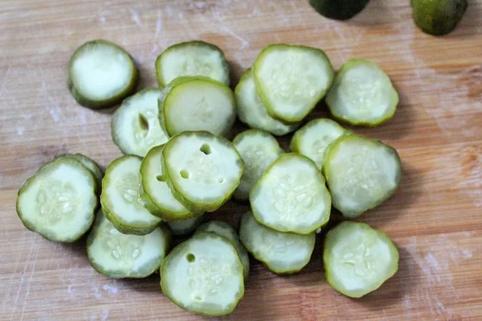 - If pickles are whole, slice them into ¼ in - ½ in slices.