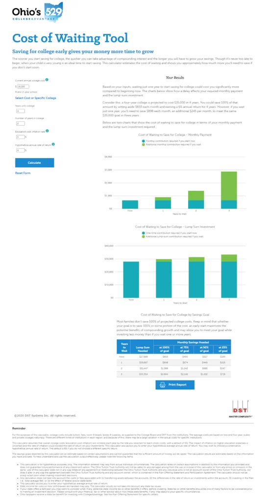 With the Cost of Waiting Tool from Ohio’s 529, you can play around with the numbers to see how much you can save with the timeline you have. Here’s a tip – start early. The earlier you start saving, it will be easier to reach your goals. Even if you can only save bit by bit, just start. There’s financial assistance out there such as grants and scholarships that will help offset some costs, but if you’re deadset on saving for college, then get started early and make consistent contributions! The money that goes into your 529 plan does not have to come just from parents, it can be gifted by grandparents, etc.! They can make contributions at any time for any reason (birthdays, graduation, milestones, etc.) and if your child gets a job and agrees to save towards school, you can add it to their 529!