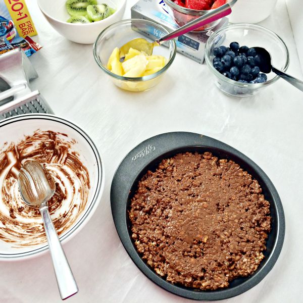 What’s really fun about Quaker Chewy Dipps is that if you microwave them for about 20 seconds, it turns into this chocolatey, gooey mess that you can mix together, smash into a mini cake pan and let it sit for a few minutes to harden back up. Instant crust for just about anything! With that successful experiment, I decided to combine two ideas: granola bars and fruit pizza.