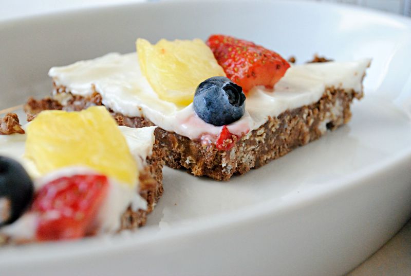 You’ll want a thin layer of the “sauce” (the cream cheese marshmallow mixture), so spoon on some and spread evenly. Top (and have fun) with your favorite fruits, slice with a sharp knife dipped in hot water, and serve!