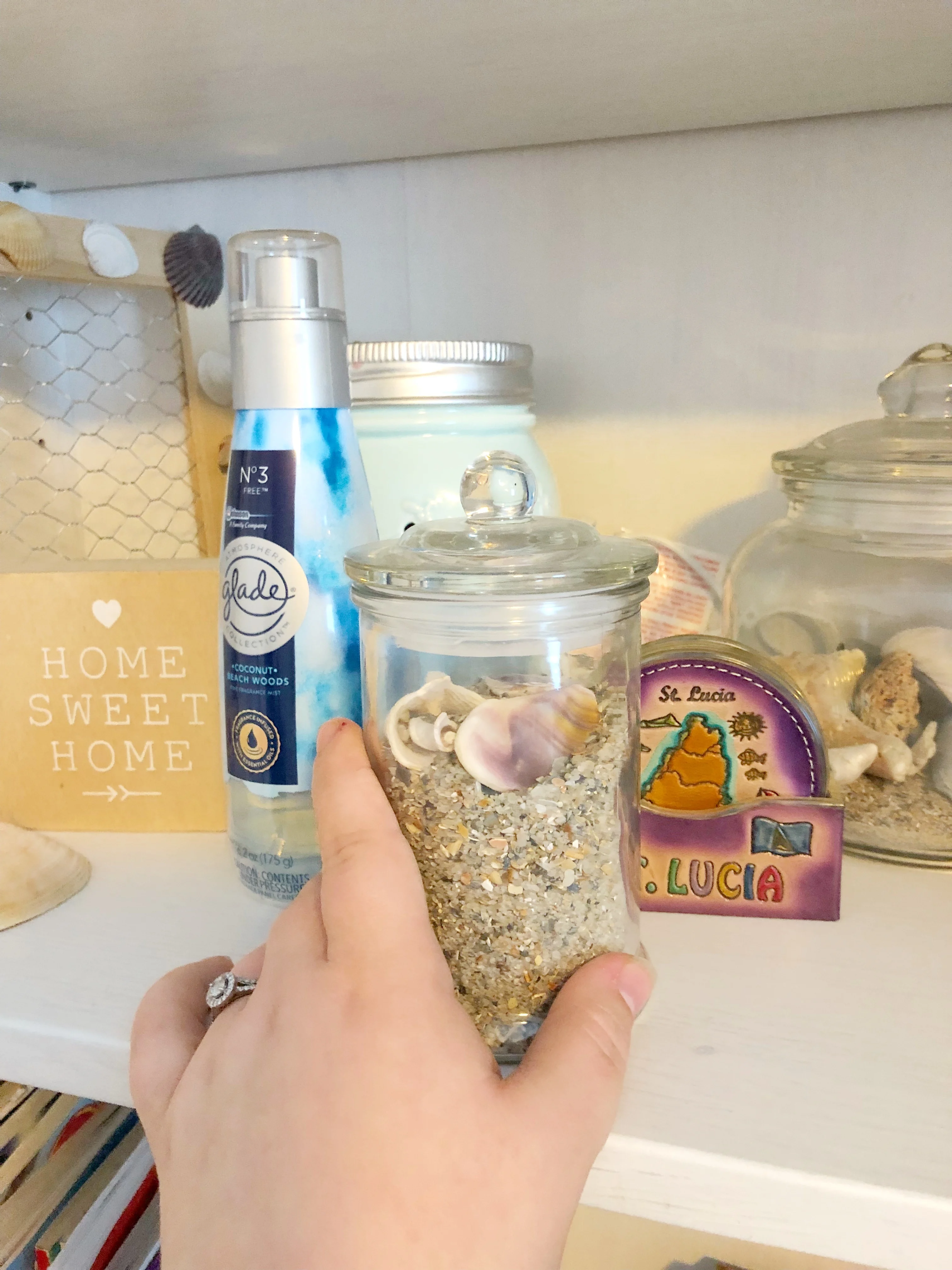 When I first experienced Glade® Atmosphere Collection™ Fine Fragrance Mist No.3 Free™ scent it was like it was a magical spray meant to put me into a dream. The mix of soft vanilla with beach wood and citrus fruits is everything I think of when I picture the beach. Whether it’s a family vacation on the east coast or a romantic getaway in St. Lucia, it all came back to me. I immediately looked to our seashells we have in our living room. I looked at our drink coasters we found in St. Lucia. Little things we brought home so we would always remember those vacations.