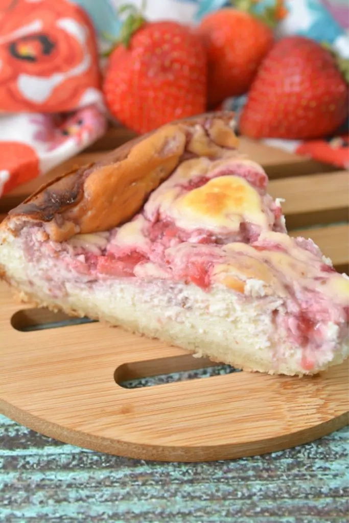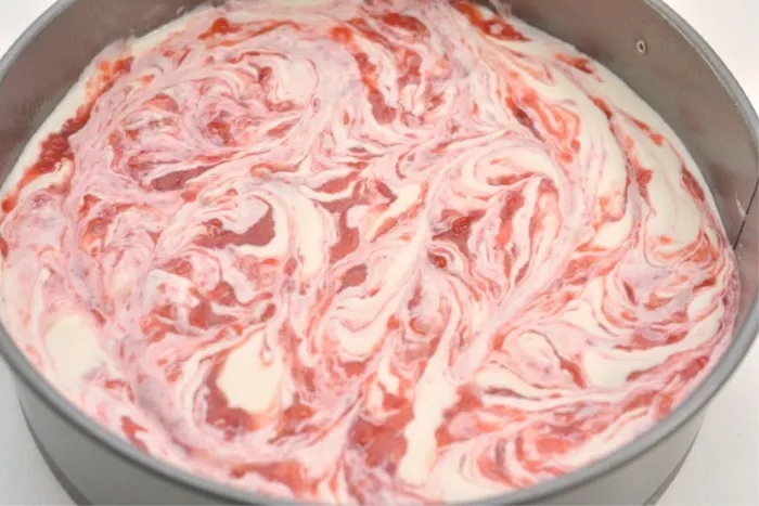 - Use a butter knife to swirl the strawberry topping along the surface of the cheesecake.