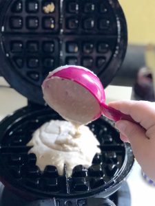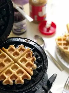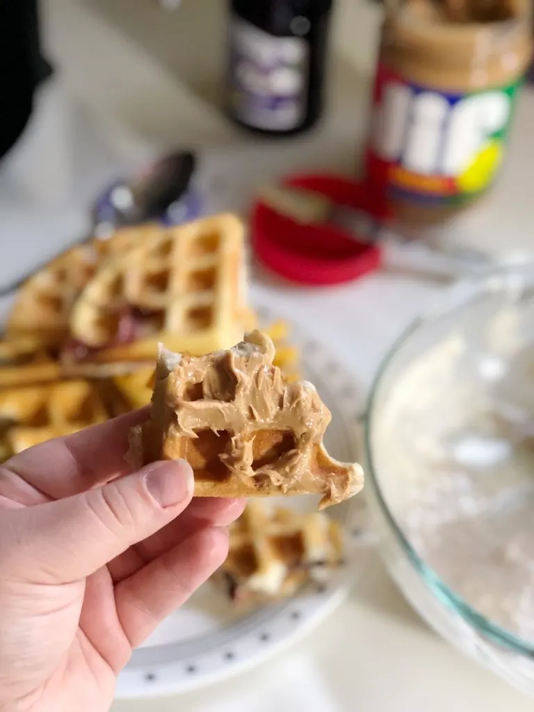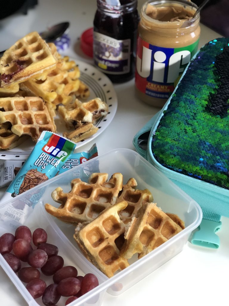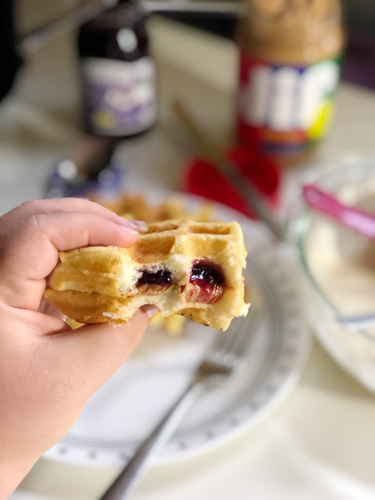 I can’t count how many times we’ve had a late dinner or felt like we were skipping lunch because of a sports practice or game! It seems to happen often, especially in the spring and fall when we have multiple sports going on and our calendar is filled to the brim with things to do and places to be. I hate when the kids reach for junky foods as their go-to snack or on-the-go lunch, so I’ve been trying to come up with fun and mess-free options and I might have a solution that works for any time of the day – PB&J Waffles!