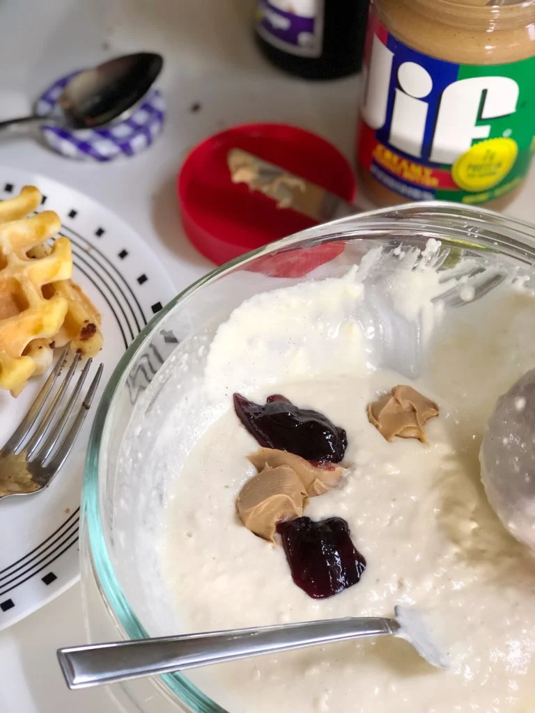 So what about waffles with Jif® Peanut Butter and Smucker’s® Grape Jam inside? Depends on how you do it, I can tell you that! If you try to add small dollops of both to your batter before you close the waffle iron, you end up with a huge mess. Sure, experimenting is fun and the kids thought the mess was hilarious, but not the greatest option for a busy family who needs a wholesome, kid-friendly bite.