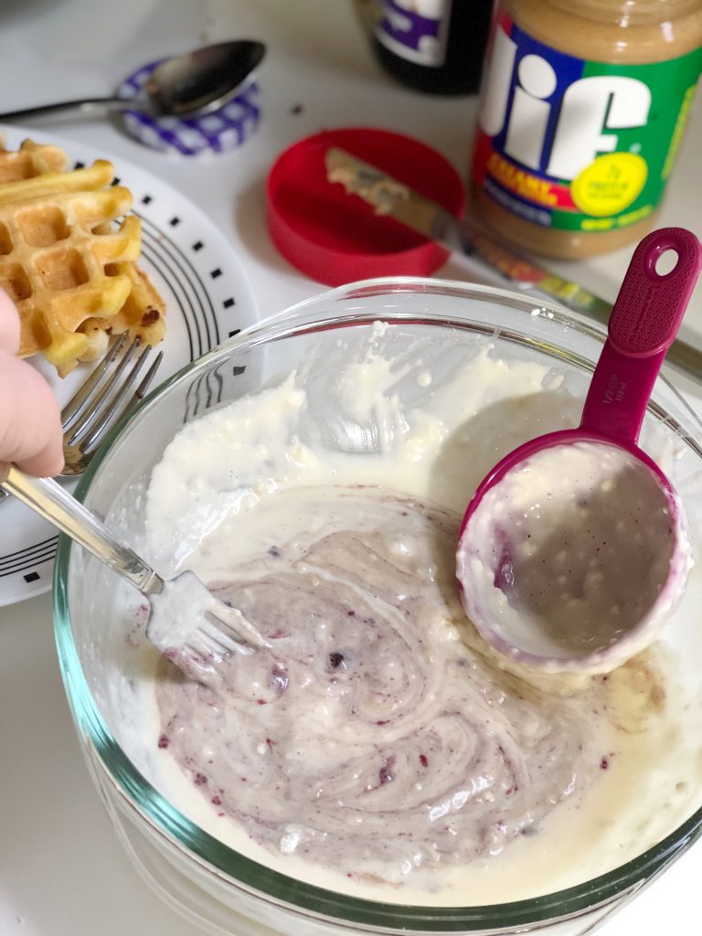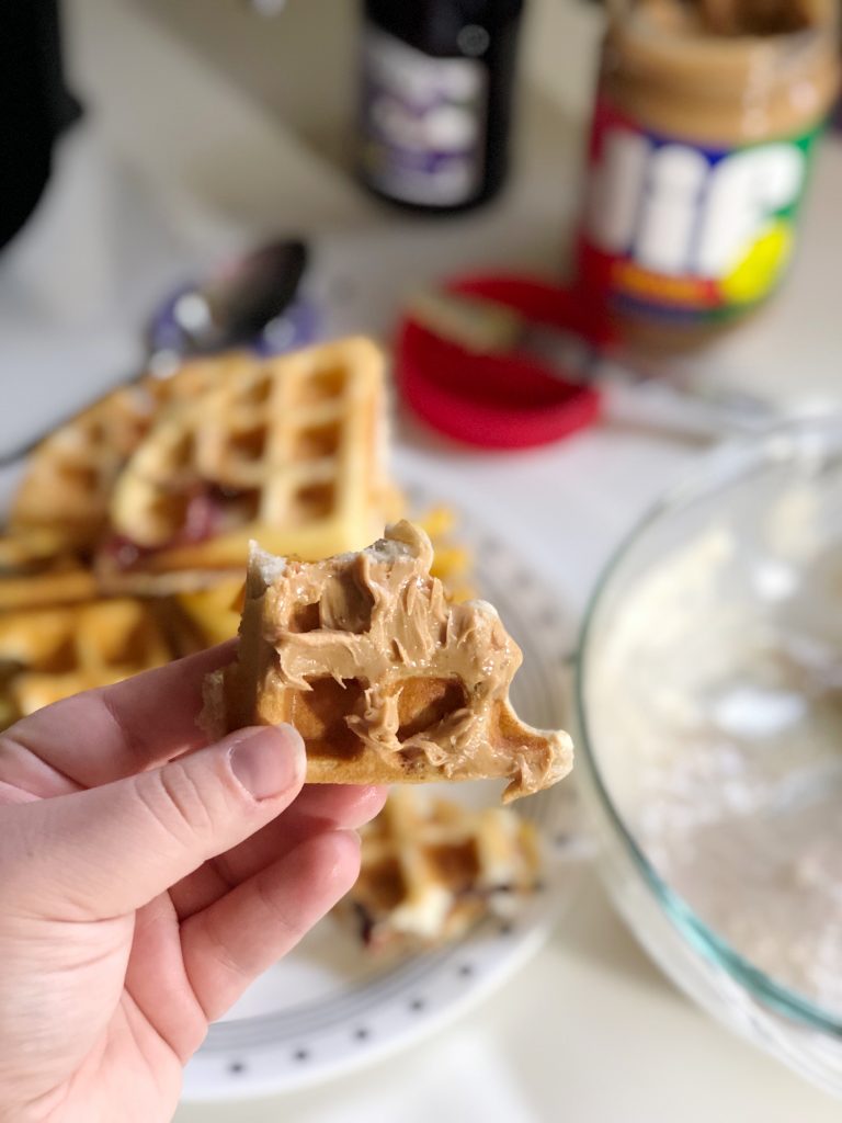 It works! These aren’t technically “stuffed”, but you can adjust how much peanut butter and jam you use and the waffles take on more of a peanut butter flavor or a deliciously sweet grape jam flavor (and a hint of color)! These were AWESOME and totally mess-free.