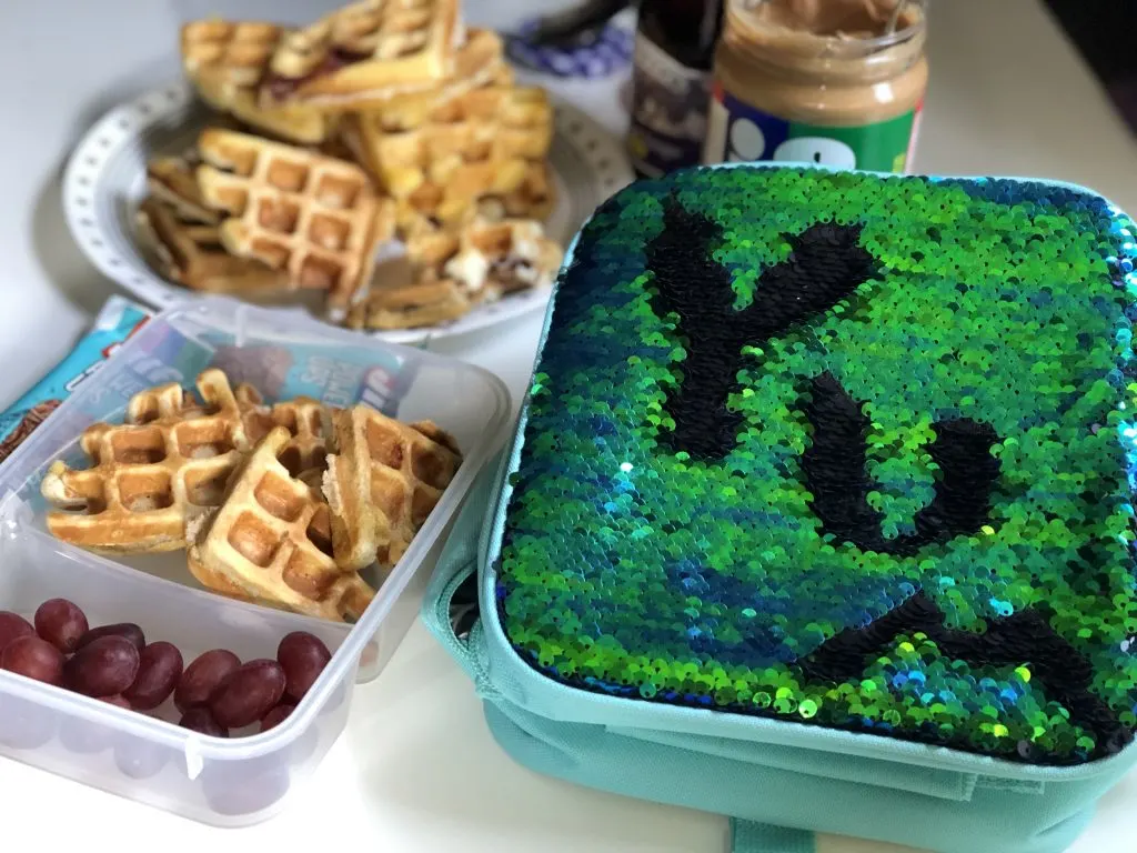 Using some reusable lunch containers, I can make up several of these PB&J waffles with fruit or cheese and everyone has a quick grab-and-go option for school or sports!