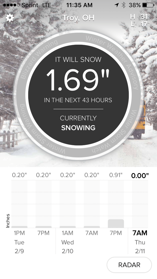 Using the app, I can line up our snow removal and ice removal gear. Shovels, sidewalk salt, gloves, hats, coats and boots can be readied in advance. I can also plan out whether or not we’ll shovel at all, or if the dusting of snow isn’t worth it. Our house has a few outdoor steps, so it’s important that those are safe since we use them daily.